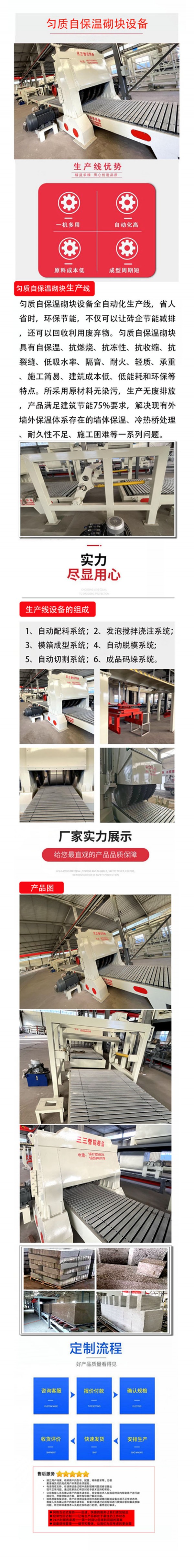 自保温砌块主要以水泥、河砂、废煤灰、发泡剂及水为原料,通过添加外加剂,经科学配比,混合和高压发泡而制成,具有强度高、容重低、保温吸引效自保温砌块设备]在生产过程中耗电率低、不燃煤,不排污,生产成本低,其节能、环保、利废、提效的优点,已得到建筑设计、施工部门认可,可广泛使用于高层框架结构建筑工程。
