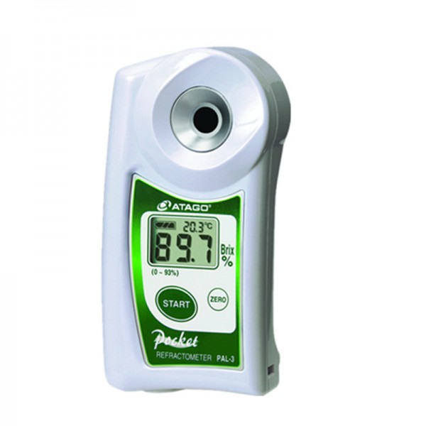 PAL-3 便携式数显折射仪,也称为数显糖度仪,数显浓度仪,手持折射仪,宽量程折射仪是ATAGO(爱拓)折射仪产品中的畅销产品。PAL-3 便携式数显折射仪,手持折射仪,宽量程折射仪具有全量程和高精度的特点(糖度( Brix )0.0 至 93.0%),手持折射仪,宽量程折射仪适用于测量各类果汁、食品、饮料以及某些化学品或工业溶剂如切削油、清洗液和防冻剂等。