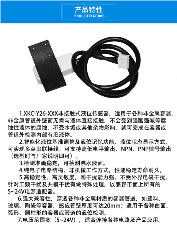 液位感应器采用了先进的信号处理技术及高速信号处理芯片,突破了容器壁厚的影响,实现了对密闭容器内液位高度的真正非接触检测。液位传感器(探头)安装于被测容器外壁的上下方(液位的高位与低位),非金属容器无需对其开孔、安装简易、不影响生产。可实现对高压密闭容器内的各种有毒物质﹑强酸﹑强碱及各种液体的液位进行