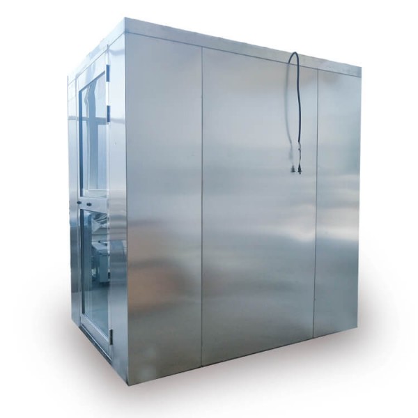 山东烟台风淋室是人/货进入洁净室所的通道,为了减少由于人/货进出带来的大量尘埃粒子,在洁净室的入口处安装功能的“气闸室”可以减少空气污染微粒的数量。风淋室内的空气由风机的送风经初效过滤器进入静压箱,经空气过滤器过滤后,洁净空气以22~25m/s的风速从风淋室的喷嘴喷出,喷嘴角度可调节,可地吹除人身或携带物品表面附着的尘埃,尘埃再回收进入初效空气过滤器,如此循环可以风淋除尘的目的。风淋室主要用于一些易燃易爆并且空气质量要求严格控制的区域。