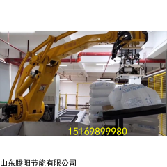 全自动破包机械手可以处理多种袋装粉状颗粒状物料的拆垛破包上料作业,因而在石油化工、原料、建材、饲料肥料、粮食、塑料、碳黑、矿业、食品添加剂、水泥等行业中使用。由山东腾阳生产制造的拆包机械手其工艺流程和系统组成为: