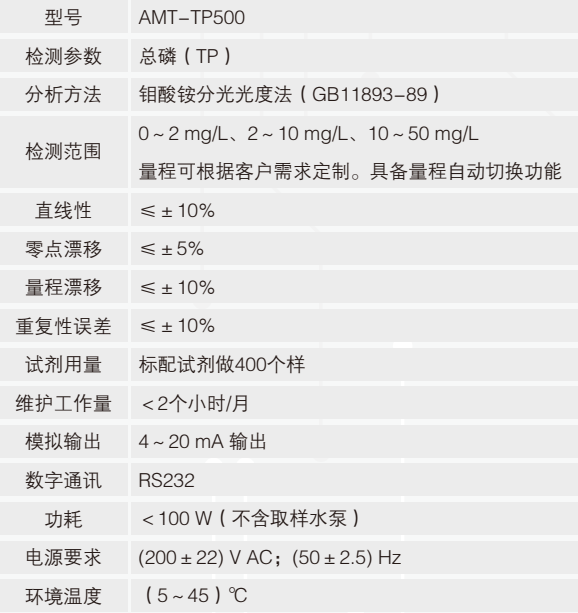 AMT-TP500型总磷在线分析仪是一种用于测量污水总磷的全自动在线分析仪,本产品采用恒温光纤、消解比色一体化等技术,实现高精度、低检出限、高稳定性和低维护量的总磷全自动在线监测。本产品工作原理符合《GB 11893-1989水质 总磷的测定-钼酸铵分光光度法》的技术要求,完全满足污染源、工业生产过程、市政污水等领域的应用,并通过了CCEP认证。