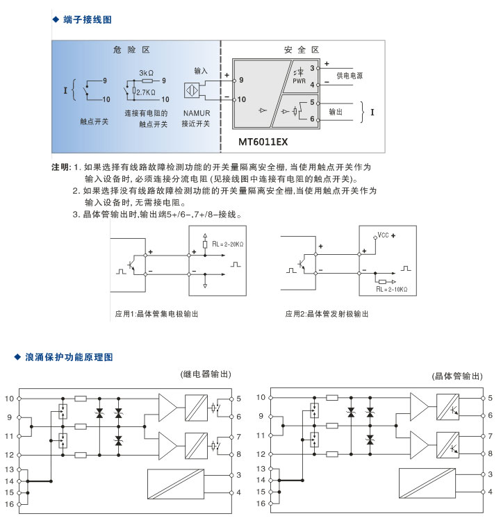 注意:当用到线路检测功能时,如果需要使用机械触点开关作为输入设备时, 则必须在输入回路中连接分流电阻(参见端子接线图 )。以避免开关量安全栅将机械触点开关正常的通断误当做输入回路的断路或短路故障。