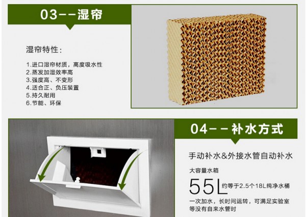 6 室内显热负荷大时,利用干热空气进行蒸发汽化;具有良好的制冷效果。 7 空气温度越高,越干燥,越能提高加湿能力,加湿饱和效率高达90%以上。 8 蒸发材料不含表面活性剂,自然吸水,扩散速度快,效能持久;不含易使皮肤过敏的苯酚等化学物质,安装使用时对人体五毒无害,绿色、安全、节能、环保、经济适用。 9 单独安装机型,自带风机,根据室内加湿负荷选择型号和台数。 10 配有万向脚轮,移动方便,气流方向可调节。 11 蒸发材料为进口高比表面积防伪湿膜,特种植物纤维蜂窝结构材料,波高、波纹交错对置,采用高分子材料与空间交联技术,高吸水、高耐水、抗霉变、使用寿命长,可达7~9年。
