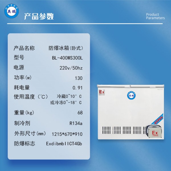 防爆冰柜(卧式冷冻冷藏)是采用集成防爆电子器件——有源光耦固态继电器及集成防爆技术的防爆型冷柜。可广泛使用于石油、化工、矿井、医药、航空航天、军事等具有 II C级防护要求、温度组别为T4组爆炸性气体混合物的1区(或2区)危险性场所;防爆冰柜(卧式冷冻冷藏)箱内防爆性能适用于具有II C级、温度组别为T6组的爆炸