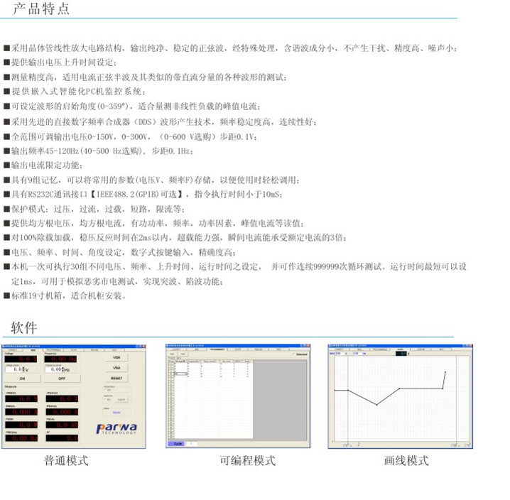 ■本机一次可执行30组不同电压、频率、渐变时间、运行时间之设定, 并可作连续作999999次循环测试。运行时间短可以设定1ms,可用于模拟恶劣市电测试,实现突波、陷波功能;