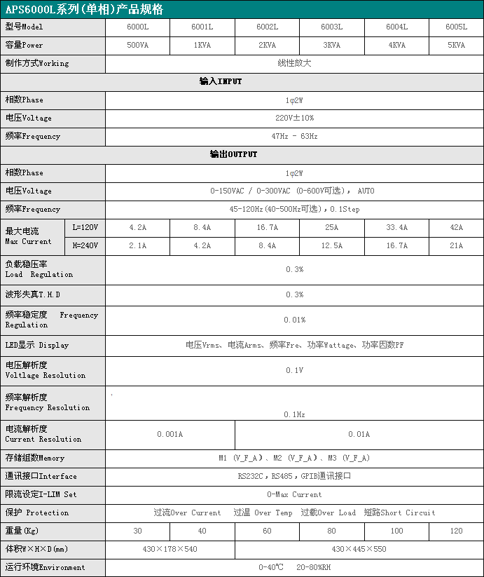 APS6000L 线性式可编程交流电源◇产品特点■采用晶体管线性放大电路结构,输出纯净、稳定的正弦波,经特殊处理,含谐波成分小,不产生干