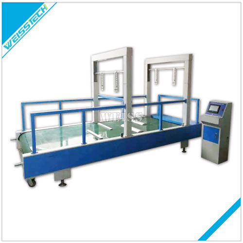 箱包颠簸磨耗试验机用于附有轮子的旅行箱、旅行包、童车…的行走试验,测试其在行走使用时皮箱轮之使用品质,通过测试里程、测试速度,以检视皮箱轮之耐热、破裂及损耗量,检测轮子材料的耐磨性及箱子的整体结构有无破坏情形及变形,试验的结果,可供作改进的参考。