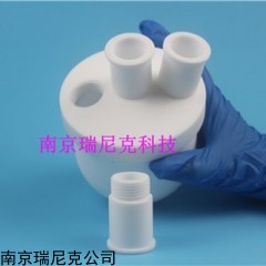 6、当溶液需要长时间的反应或是加热回流时,一般都会选择使用聚四氟乙烯烧瓶作为容器。烧瓶的开口没有像烧杯般的突出缺口,倾倒溶液时更易沿外壁流下,所以通常都会用四氟搅拌棒轻触瓶口以防止溶液沿外壁流下。