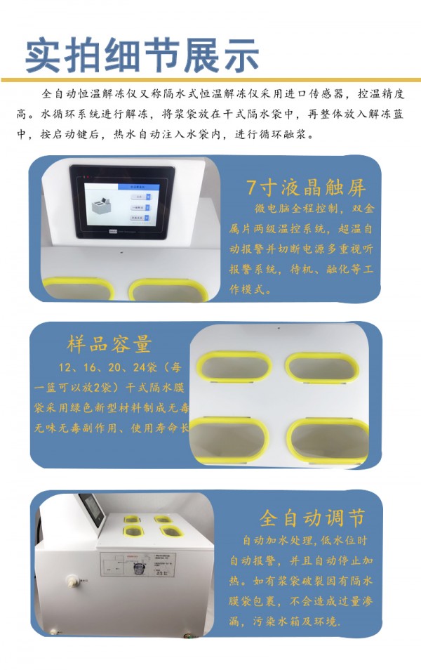 全自动智能电脑控制,自动调温,自动加水处理.解冻迅速、充分、无瞬间温差,温度均衡,不会破坏血浆的有效成分。优质不锈钢内胆,保证水质清洁卫生。 自动补水功能,无需人工操作。 台式全自动恒温解冻仪隔水式解冻机化浆机血液融浆机干式