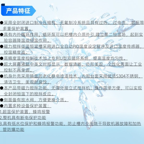 内部特殊设计具有磁力搅拌系统,可把放入恒温槽工作室内烧杯中的样品恒温同时直接进行磁力搅拌,无需用机外竖立式搅拌电机对烧杯中的样品进行搅拌。精密控制高低温合成、增加反应体系内温度的均一性。广泛应用在实验室、化工厂、制药厂、医院、生物酶、科研等实验和检定工作中。磁力搅拌低温恒温槽 无需外接立式搅拌机 操作