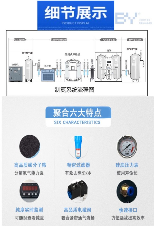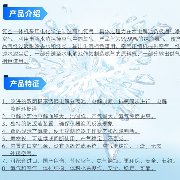 氮空一体机发生器 气相色谱仪用气体源空气源采用电化学法制造高纯氮气,具体过程为在水电解池负极通纯净空气,利用电解水消耗掉空气中的氧气,产品气为99.99%的纯净氮气。该产品气经过吸附除去水和烃类,输出供气相色谱用。空气压缩机提供空气,经滤水滤尘后,一部分送至水电解池作为制造氮气的原料气,一部分输出供气相色