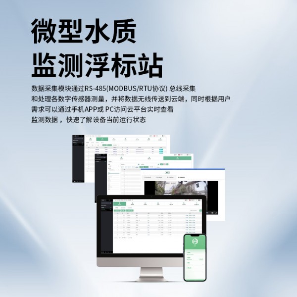 本公司推出的微型水质监测浮标可以实现多种水质参数的同时测量,包括溶解氧、pH、ORP、电导率和浊度等。数据采集模块通过RS-485(Modbus/RTU协议)总线采集和处理各数字传感器测量得到的数据,并将数据无线传送到云端,同时根据用户需求可以在APP等多平台上获取传感器测量值。