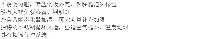 不锈钢内胆,喷塑钢板外壳,聚胺脂泡沫保温,设有大视角观察窗、照明灯,外置智能雾化器加湿,可大容量补充加湿.