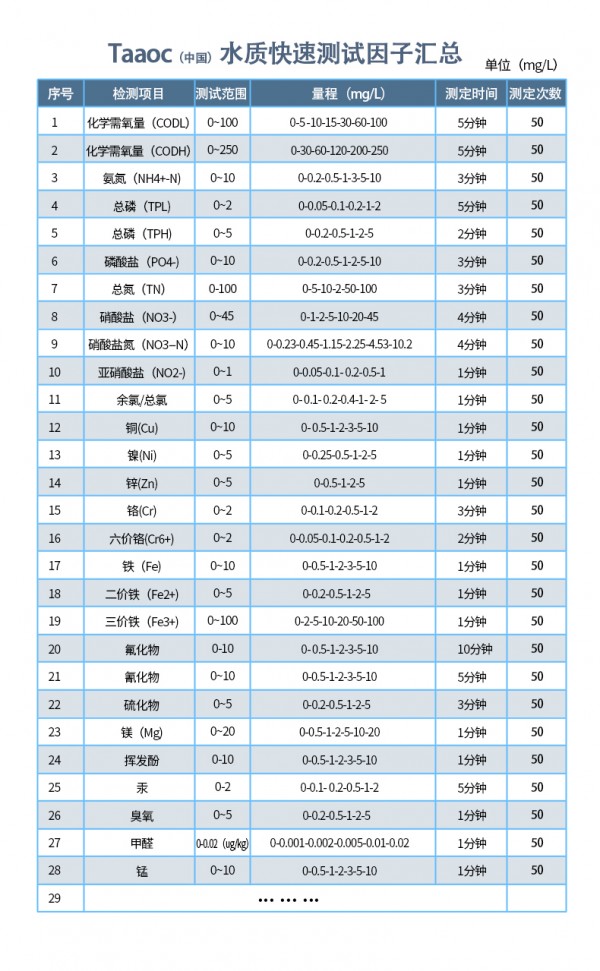 涛克 水质快速检测包高锰酸盐指数快速测试包0-100mg/l可快速测定水中的高锰酸盐指数含量,小巧、便捷,便于携带,无论您是在生产现场进行快速测定,还是在户外进行快速排查,测试包均能满足您的水质检测使用需求。涛克 水质快速检测包高锰酸盐指数快速测试包0-100mg/l集成了水质分析领域成熟技术,整个操作流程简单、快速,检测结果稳定可靠。