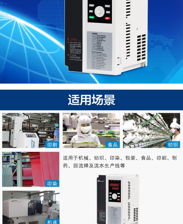 适配电机功率范围为:380V:0.75KW~280KW;220V:0.75KW-2.2KW。