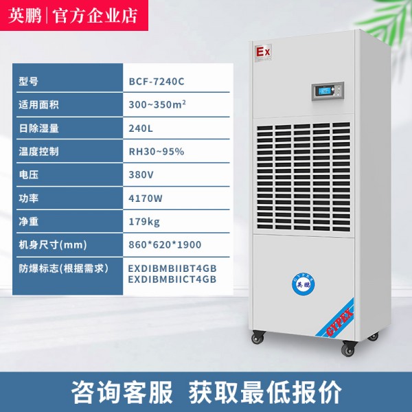 英鹏防爆除湿机BCF-7240C我公司出品的防爆除湿系列机型通过特殊防爆技术加工处理,广泛应用于国防、科研、石油、化工、医药、加工制造、生物等存在ⅡA、ⅡB级,T1~T4组可燃性气体、蒸汽与空气混合形成的易引发爆炸的危险场所,是针对有防潮除湿要求场所设计的特种除湿调温设备,具有降湿、低热、通风等多种功能。系列产品均通过国家防爆电气产品质量监督检测检验,获得国家防爆电气设备防爆合格证:英鹏防爆除湿机BCF-7240C;其外形美观,设计合理并具有安装维修方便等特点,全系列防爆产品内部采用压缩机、微电脑控制、温湿度切换显示,具有噪声低、性能稳定、操作简便等优点。深受广大特需行业客户喜爱,并以部分录入特需行业定点采购名录