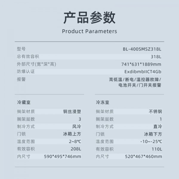 英鹏防爆冰箱BL-400SMSZ318L采用英鹏压缩机和英鹏风扇电机,制冷快,噪音低。加厚保温层,超微孔发泡技术保温效果好。无氟发泡、无氟制冷剂,绿色环保合理优化蒸发冷凝系统设计,制冷强劲。 两种故障报警:高低温报警、传感器故障报警。两种报警方式:声音蜂鸣报警、灯光闪烁报警。多重保护功能:开机延时、停机间隔、键盘锁定等。