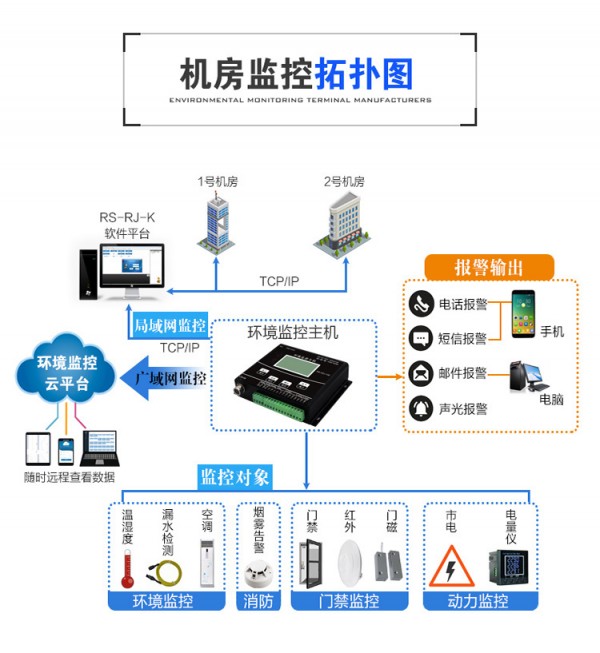 机房动环监控系统短信电话远程温湿度环境报警主机停电漏水监测集软硬件于一体,采用B/S架构,便捷的嵌入式WEB服务方式监控系统内容包括温湿度、烟感、空调、漏水、红外、市电、配电、蓄电池、门禁、控制、视频等监测项,实现了集中监控、远程监控,数据实时查询、故障报警等功能。