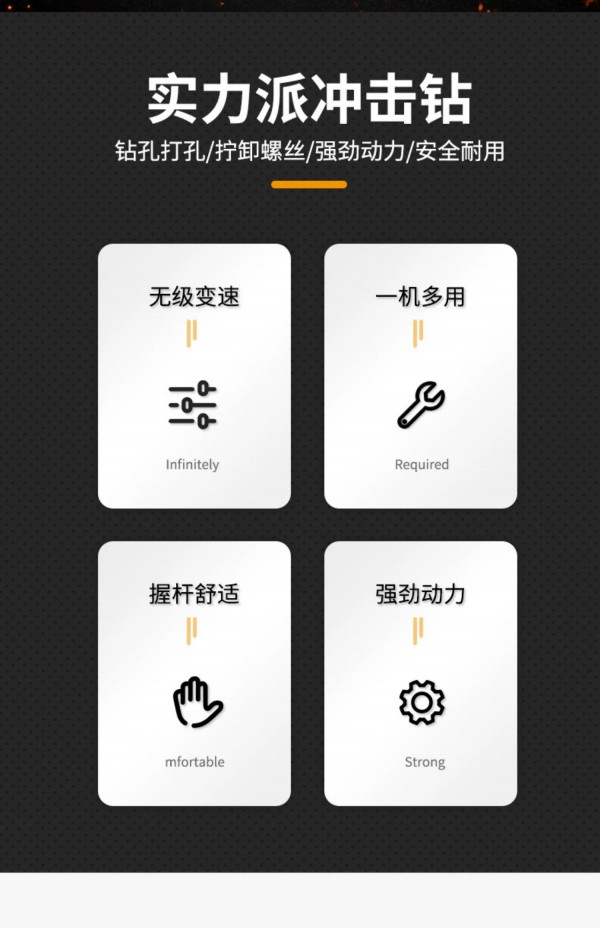 实力派冲击钻—钻孔打孔/拧卸螺丝/强劲动力/安全耐用—无级变速、一机多用、握杆舒适、强劲动力