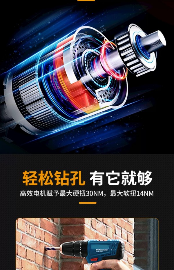 轻松钻孔 有它就够——高效电机赋予硬扭30NM,软钮14NM