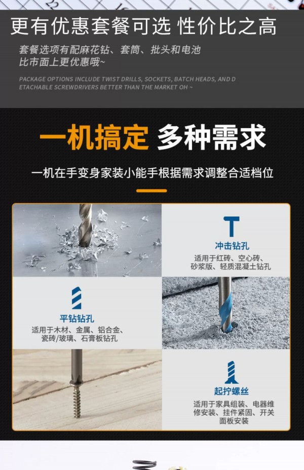 一机搞定 多种需求——冲击钻孔、平钻钻孔、起拧螺丝(钻头可调节,高品质快换来头)