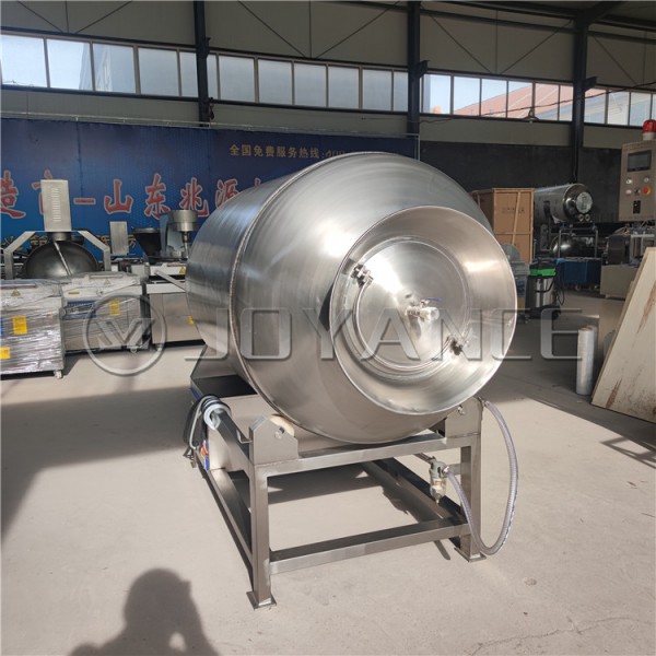 真空滚揉机和真空拌馅机在香肠加工中的区别虽然滚揉机也具有搅拌功能,但是它的搅拌在实际情况上的效率没有拌馅机的效率高,使用滚揉机搅拌馅料,首先一点就是香肠配料里的配方,有很多香肠的腌制时间比较长,比如我们试验的德国香肠,他的腌制时间需要12个小时,并且不需要太高频率的搅拌,反而需要静止腌制,因此真空滚揉机刚好适合。