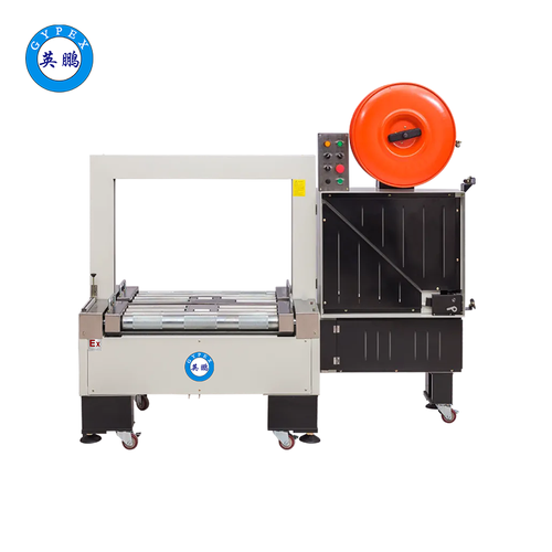 佛山鹏义防爆全自动低台捆扎机900型可广泛应用于各行各业进行各类包件(除环形外)的快速捆扎。可单机捆扎,亦可多机安装在包装线上使用。
