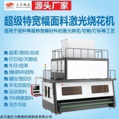 超级特宽幅面料卷料激光烧花机适用材料:适用于德绒、牛仔、皮革、超柔、植绒布、墙纸墙布、丝绒、灯芯绒、绒、阳离子、、罗纹、雪尼尔、科技布、羊毛双面尼、运动面料、毛巾毛毯、TR、锦氨面料等各类针织、梭织、无纺面料。