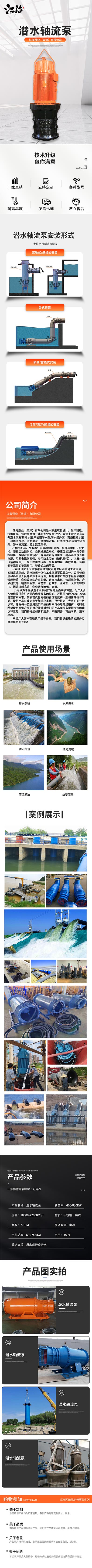 潜水轴流泵的潜水电机置于泵的上方,潜水电机为干式结构,采用F级绝缘,可靠的机械密封及辅助密封,并设有泄漏和内部绕组、轴承温升保护装置,配备控制柜、运行安全可靠,运载水质和环境适应广、叶片可调、工况范围大。