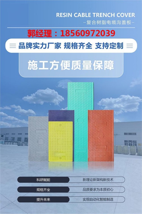 我公司定位于生产中高端复合电缆沟盖板,产品规格全、品种多、产量大、性价比高。我公司生产的国家产品--高分子模压盖板,分BMC、SMC两大系列,年产能力上百万件。产品是由高分子聚酯树脂加多种高分子材料,经高温高压一次模压成型,具有强度高、硬度高、重量轻、抗腐蚀、抗老化、美观防盗等优点。经国家权威部门检测,各项指标均达到国家标准。产品销往全国各地,是电缆沟盖板很理想的选择。我公司新研发的纳米涂层电缆沟盖板是引领行业发展的新趋势。