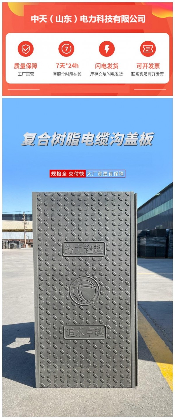 我公司定位于生产中高端复合电缆沟盖板,产品规格全、品种多、产量大、性价比高。我公司生产的国家产品--高分子模压盖板,分BMC、SMC两大系列,年产能力上百万件。产品是由高分子聚酯树脂加多种高分子材料,经高温高压一次模压成型,具有强度高、硬度高、重量轻、抗腐蚀、抗老化、美观防盗等优点。经国家权威部门检测,各项指标均达到国家标准。产品销往全国各地,是电缆沟盖板很理想的选择。我公司新研发的纳米涂层电缆沟盖板是引领行业发展的新趋势。