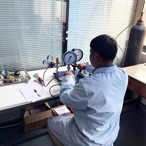 当高压气瓶的压力为p时,我们通过进口施加压力到1.3倍的p,用捡漏液检查,应无气泡出现。继续增加压力,直到有气泡冒出,记录好此刻的压力。然后逐步降低压力直至阀门关闭,此时的压力要大于p才对。