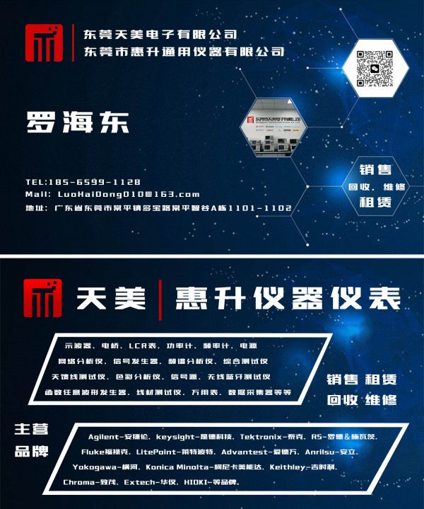 *供应-回收-维修-租赁*<示波器、电桥、LCR表、功率计、频率计、电源 <网络分析仪、信号发生器、频谱分析仪、综合测试仪 <天馈线测试仪、色彩分析仪、信号源、无线蓝牙测试仪 <函数任意波形发生器、线材测试仪、万用表、数据采集器等等。 主要品牌: HP-惠普、Agilent-安捷伦/keysight-是德科技、Tektronix-泰克、Fluke福禄克、 LitePoint-莱特波特、Advantest-爱德万、Anrilsu-安立、R/S-罗德&施瓦茨、 Yokogawa-横河、Konica Minolta-柯尼卡美能达、Keithley-吉时利、