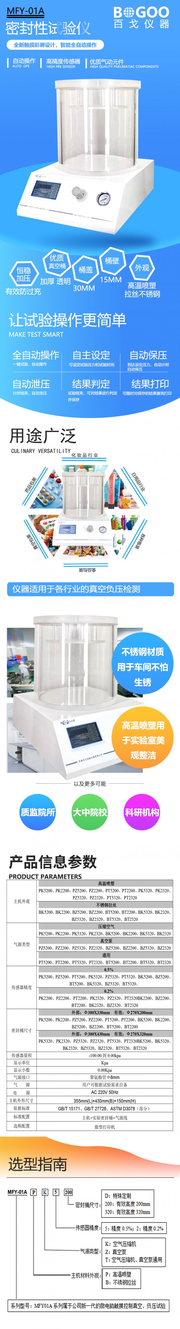 MFY-01A P系列软包装密封性检测仪主要由特制透明真空室(有机玻璃桶)、主机控制系统等组成。通过微电脑系统采集传感器信号,按照指令控制电磁阀等相关压力部件,一实现不同的试验过程。并且通过对真空室抽真空,使浸在水中的试验样品产生内外压力差,观测真空室内试验样品的气体外逸或水向内渗入情况,以判定试验样品的密