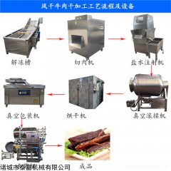 麻辣风干牛肉生产线生产牛肉干主要的加工设备有,盐水注射机,真空滚揉机,切肉机,烟熏烘干炉,油炸机、甩油机、八角拌料机,真空包装机、杀菌锅、洗袋机、振动筛、风干线等。