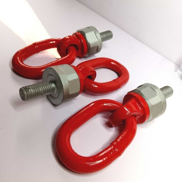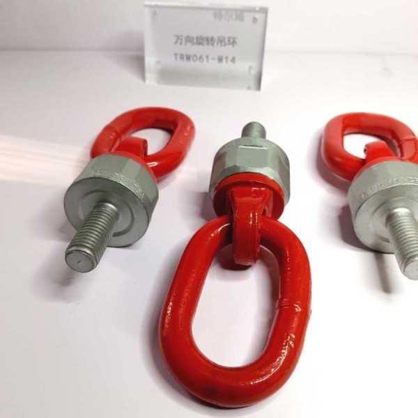 万向旋转吊环是吊装时和链条吊具配套使用的一种吊具,在国外已经普遍应用,比传统吊环螺钉有更多的优势,比如在有角度吊装时,会产生剪切力和冲击力,使用传统国标吊环螺丝容易造成变形或断裂,但万向旋转吊环可以减小力臂和改变受力角度,所以安全性更有保障,目前随着安全意识的提升,一些需要翻身或者侧点受力的大型设备、模具,不规则设备基本已经淘汰了传统吊环螺钉,改用了这种新型万向旋转吊环。TRM061万向旋转吊环是特尔姆研发生产的国货旋转型吊耳吊点产品。