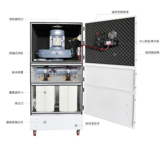 2. 脉冲反吹清灰系统,滤芯可通过清理重复使用,喷吹法多角度喷吹,清灰更彻底;