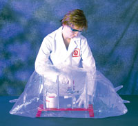 简易封闭手套箱,带有一体成型的操作手套,采用较耐酸碱的聚乙烯材质,方便收纳,另有无菌包装,气体容量有50L、280L、520L三种选择,可以随意控制袋内操作环境并灵活的运用于各种实验。