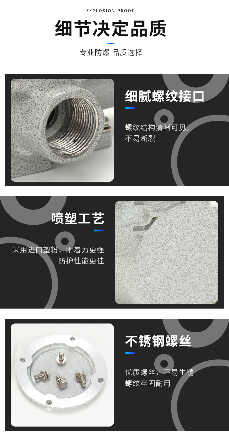 质量是企业的生命。公司生产的产品严格按GB3836-2010爆炸性气体环境用电设备等国家标准设计。建立了完善的质量保证体系和质量评估体系,产品从原材料进库到成品出厂,每一道工序都处于缜密的监控之中。公司始终密切关注和跟踪防爆行业的发展动态,不断地进行技术升级改造,保持产品、工艺技术和加工、检测设备的性。