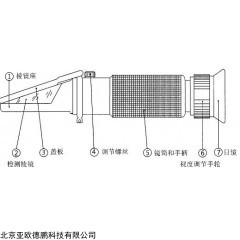 1.棱镜座 2.检测棱镜 3.盖板 4.调节螺丝 5.镜筒和手柄 6.视度调节手轮 7.目镜