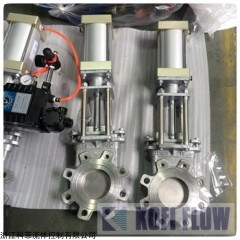 KFF科菲气动刀闸阀又称气动刀门闸阀,气动刀型浆液阀,它的启闭件是闸板,闸板的运动方向与流体方向相垂直,靠可以切割纤维材料的刀刃形闸板来切断介质。刀型闸阀关闭时,密封面可以只依靠介质压力来密封,即依靠介质压力将闸板的密封面压向另一侧的阀座来保证密封面的密封,这就是自密封.大部分刀型闸阀是采用强制密封的,即阀门关闭时,要依靠外力强行将闸板压向阀座,以保证密封面的密封性。本类阀门在管道中一般应当水平安装。