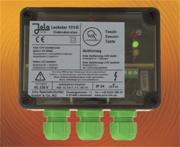 JOLA的电导继电器用于区分具有不同电导值的液体(例如,一方面是酸、碱液或盐溶液,另一方面是雨水或冷凝水)。继电器 Leckstar 101 的实施例具有由绝缘材料制成的表面安装外壳,在选择安装位置时,安装工作量很小,并且具有很高的灵活性。JOLA的 Leckstar 系列导电泄漏探测器可用于检测潜在爆炸性环境中导电液体的泄漏并发出信号。