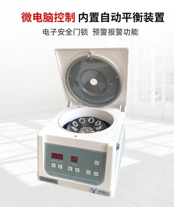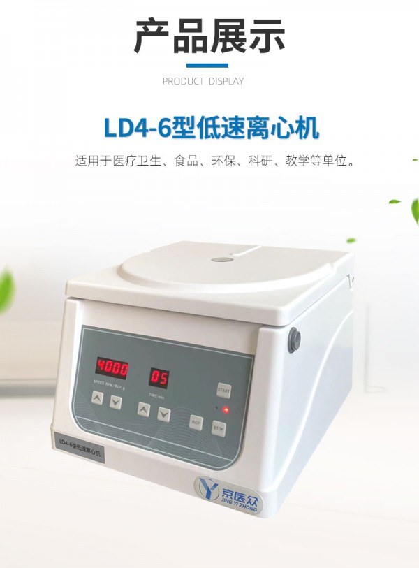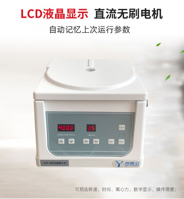 京医众LD4-6型台式低速离心机直流无刷电机,免维护;微电脑控制,可预选转速、时间、离心力,数字显示,操作简便;内置自动平衡装置;预警报警功能,多种保护,安全可靠。是医疗卫生、食品、环保、科研、教学等单位的理想设备。