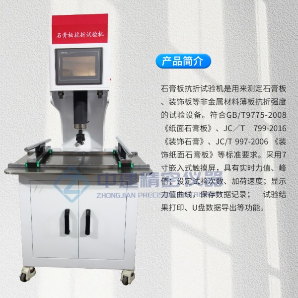 石膏板抗折试验机是用来测定石膏板、装饰板等非金属材料薄板抗折强度的试验设备。符合GB/T9775-2008 《纸面石膏板》、JC∕T 799-2016 《装饰石膏》、JC/T 997-2006 《装饰纸面石膏板》等标准要求。采用7寸嵌入式触摸屏,具有实时力值、峰值;设定试验次数、加荷速度;显示力值曲线,保存数据记录; 试验结果打印、U盘数据导