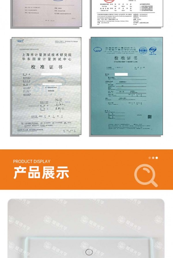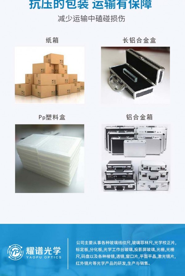 成都耀谱光学制品有限公司成立于2009年,位于美丽的"天府之国"------成都。公司主要从事各种高新技术产品的研发、设计、生产、销售与服务。主要产品包括:玻璃线纹尺系列,玻璃菲林尺系列,光学校正片系列,标定板系列,分划板系列,光学工作台系列,投影屏玻璃系列,光栅尺系列,码盘系列,各种棱镜,透镜,窗口片,平面平晶等。