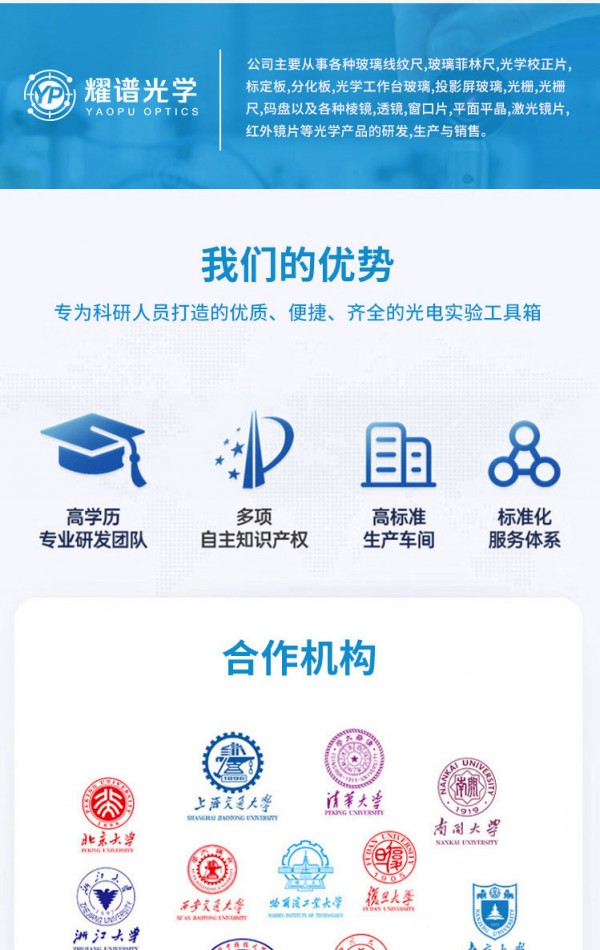 成都耀谱光学制品有限公司成立于2009年,位于美丽的"天府之国"------成都。公司主要从事各种高新技术产品的研发、设计、生产、销售与服务。主要产品包括:玻璃线纹尺系列,玻璃菲林尺系列,光学校正片系列,标定板系列,分划板系列,光学工作台系列,投影屏玻璃系列,光栅尺系列,码盘系列,各种棱镜,透镜,窗口片,平面平晶等。