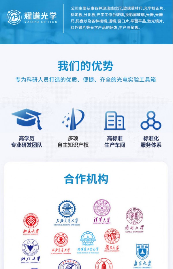 成都耀谱光学制品有限公司成立于2009年,位于美丽的"天府之国"------成都。公司主要从事各种高新技术产品的研发、设计、生产、销售与服务。主要产品包括:玻璃线纹尺系列,玻璃菲林尺系列,光学校正片系列,标定板系列,分划板系列,光学工作台系列,投影屏玻璃系列,光栅尺系列,码盘系列,各种棱镜,透镜,窗口片,平面平晶等。