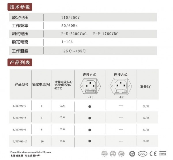 二、赛纪单相直流交流带保险丝通用型IEC插座滤波器SJD170K1 SJD170K2特点和优势