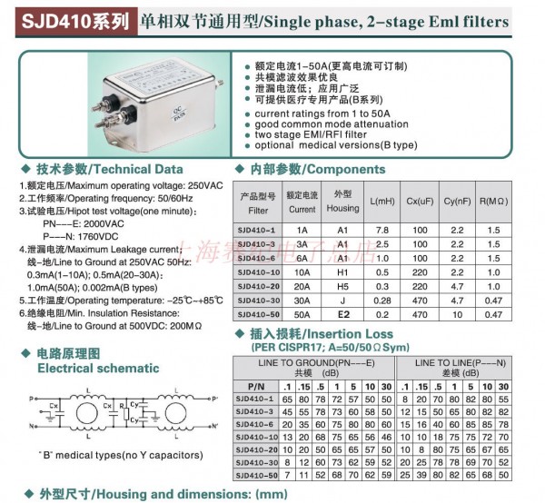 赛纪电子双节交流医疗设备专用电源滤波器SJD410B-6A
